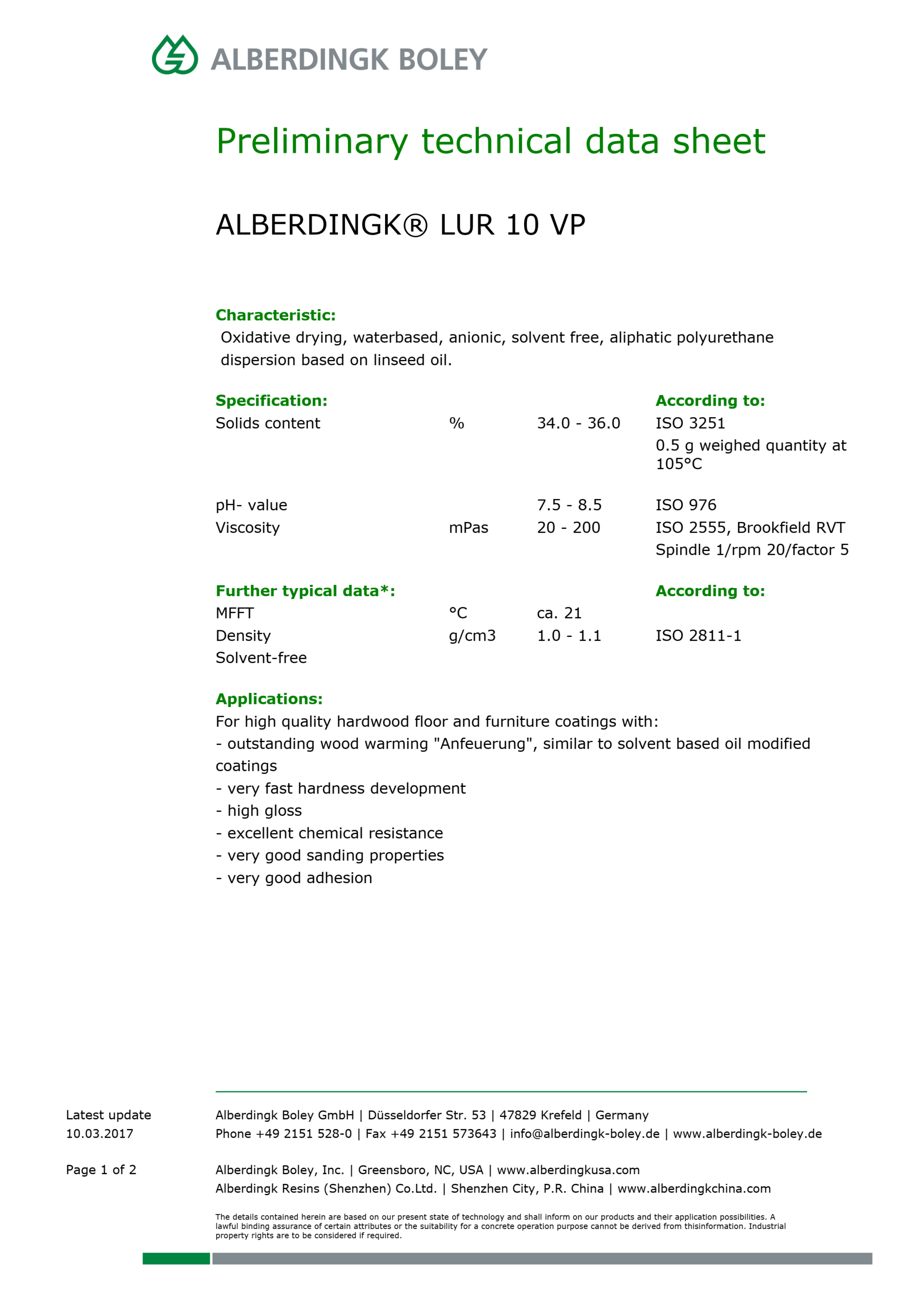 ALBERDINGK是一(yi)家成立(li)于1828年的(de)專業綠(lü)色環保(bao)水性塗(tu)料用樹(shu)脂原材(cai)料的德(de)國私人(ren)家族企(qi)業。公司(si)創立之(zhi)初就👩🍼是(shi)從事亞(ya)麻油😵💫,蓖(bi)麻油植(zhi)物基産(chan)品的生(sheng)産研發(fa)。基于自(zi)身👩🏽🐰👩🏿在蓖(bi)麻油、亞(ya)麻油植(zhi)物基原(yuan)材料在(zai)塗料工(gong)🙈業應用(yong)中的190多(duo)年的ˇ沉(chen)澱積累(lei),ALBERDINGK已經陸(lu)續開發(fa)了多😗種(zhong)木器家(jia)具、地闆(pan)塗料應(ying)用的優(you)質植物(wu)油基的(de)水性聚(ju)氨酯分(fen)🧛🏽散體産(chan)品,如ALBERDINGK CUR995、ALBERDINGK CUR991、ALBERDINGK LUR3和(he)ALBERDINGK LUR10等産品(pin),而ALBERDINGK LUR10是結(jie)合目前(qian)中國家(jia)具塗料(liao)市場油(you)轉水階(jie)段對👩🏽🐰👩🏿水(shui)性木器(qi)塗料産(chan)品性能(neng)升級之(zhi)迫👋切需(xu)求,而最(zui)新研發(fa)并成功(gong)推🛀🏼向市(shi)場的亞(ya)麻油植(zhi)物基高(gao)光高豐(feng)滿度水(shui)性脂肪(fang)族聚氨(an)酯分散(san)體産品(pin)。