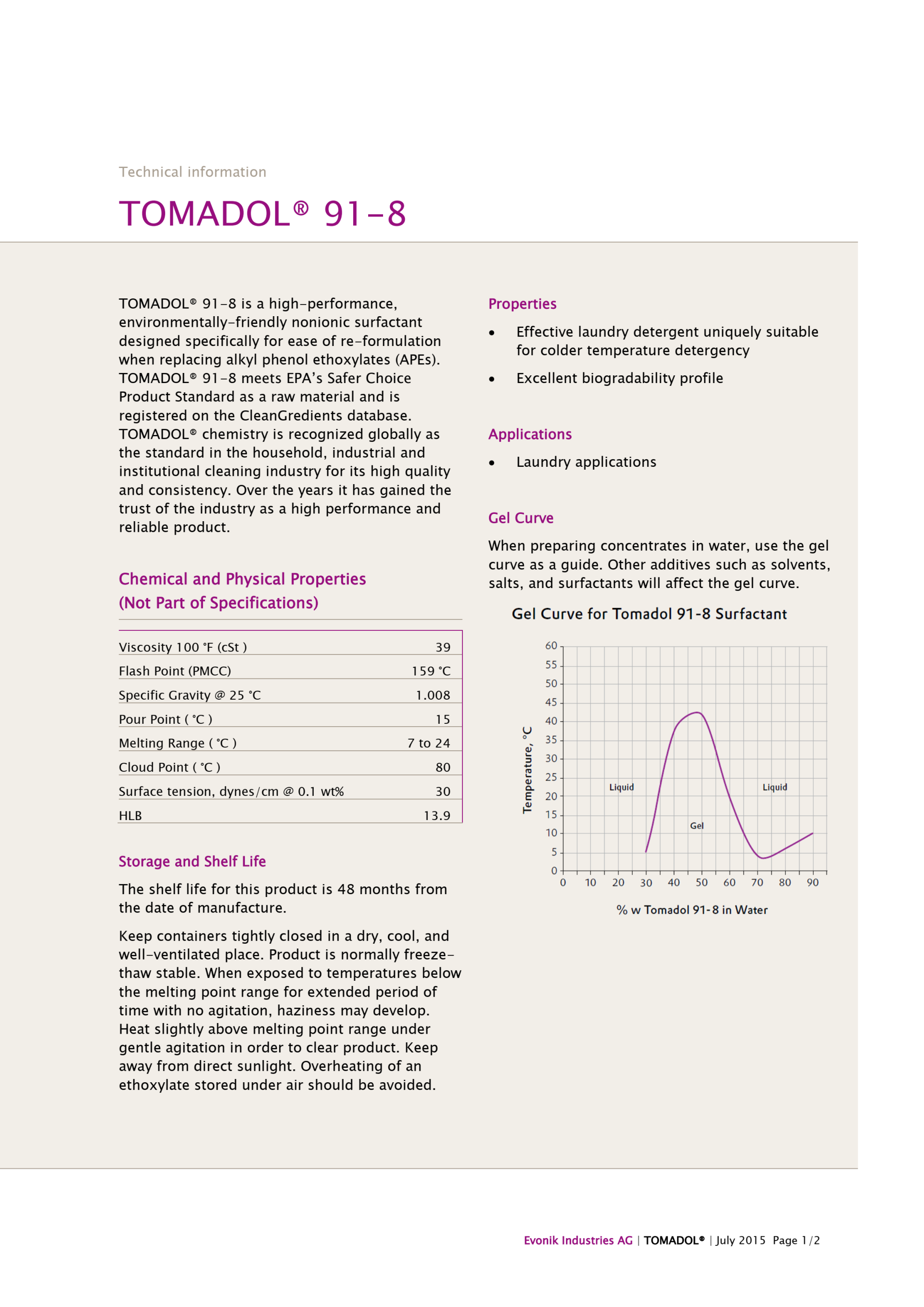 Evonik Industries AG TOMADOL 91-8 is a high-performance, environmentally-friendly nonionic surfactant designed specifically for ease of re-formulation when replacing alkyl phenol ethoxylates (APEs). TOMADOL® 91-8 meets EPA’s Safer Choice Product Standard as a raw material and is registered on the CleanGredients database.