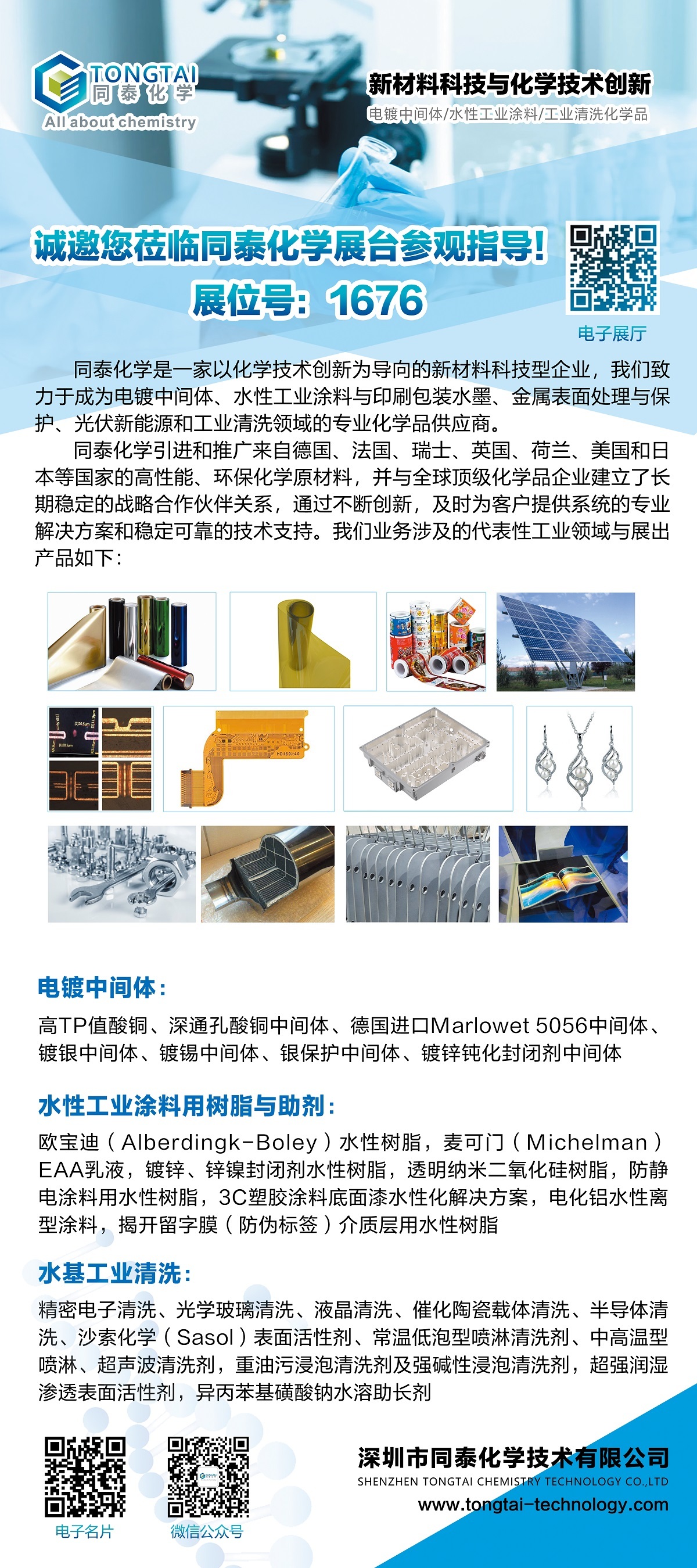 深圳(zhen)市同泰(tai)化學技(ji)術有限(xian)公司将(jiang)參加2021年(nian)9月27-29日在(zai)廣州🧑🏻❤️🧑🏼保(bao)✋利世😍貿(mao)博覽館(guan)舉辦的(de)第十四(si)屆廣州(zhou)國際表(biao)面處理(li)、電鍍👩🏿❤️💋👨🏽、塗(tu)裝展覽(lan)會,即【廣(guang)州國際(ji)表面處(chu)理展】,誠(cheng)邀您莅(li)臨同泰(tai)化學展(zhan)台參觀(guan)指導!展(zhan)位号:1676。